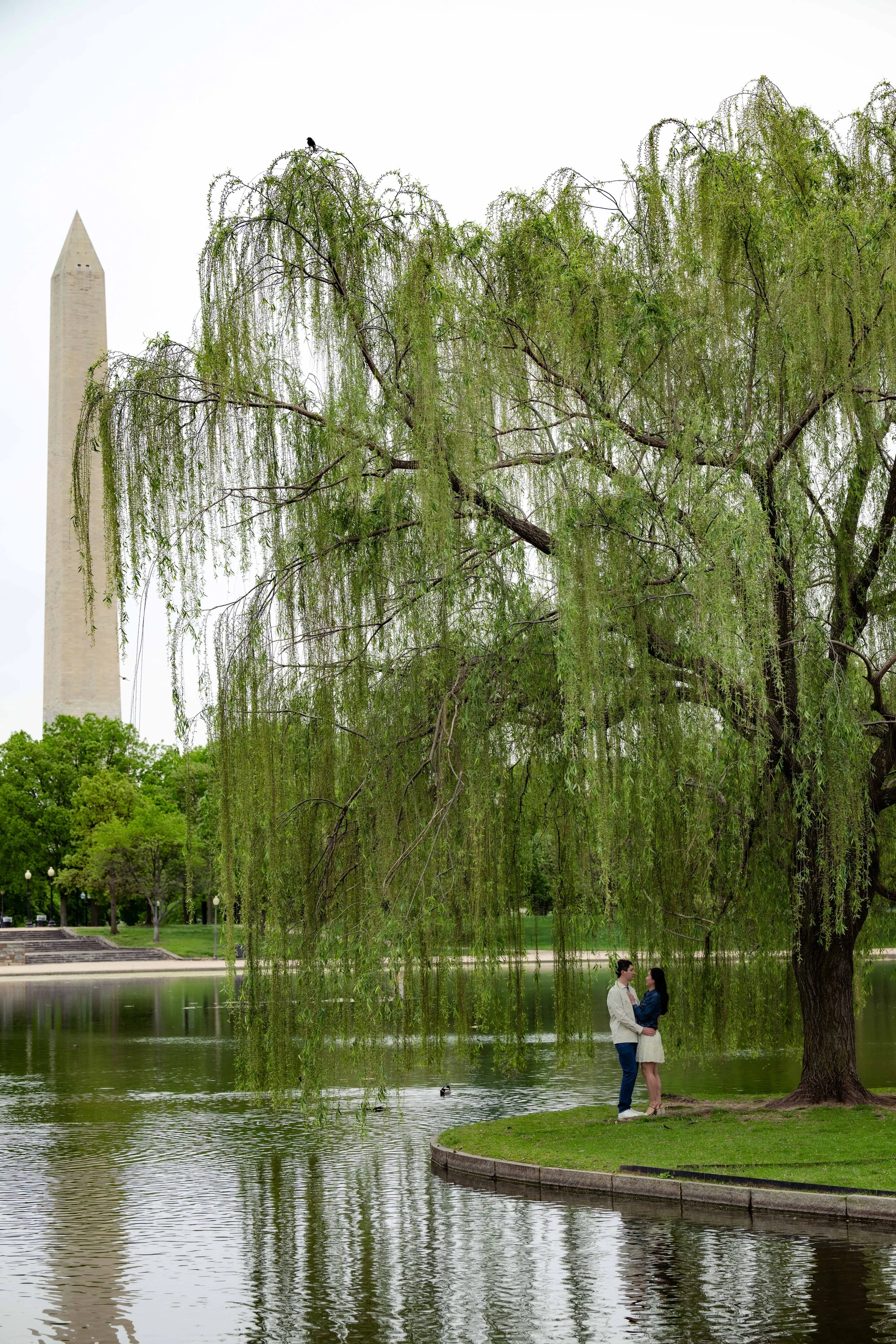 We worked with the couple to find spots and backup locations that were special to them and iconic of DC. One of our favorite spots is Constitution Gardens- here you get some iconic DC sites, like the Washington Monument and Lincoln Memorial in the background, while also grabbing those lush Spring vibes this time of year. It’s the perfect setting for a romantic and cozy feel. I think one of my favorite images here is the couple under the willow tree- I feel like this should be on the cover of some romantic getaway magazine for DC.